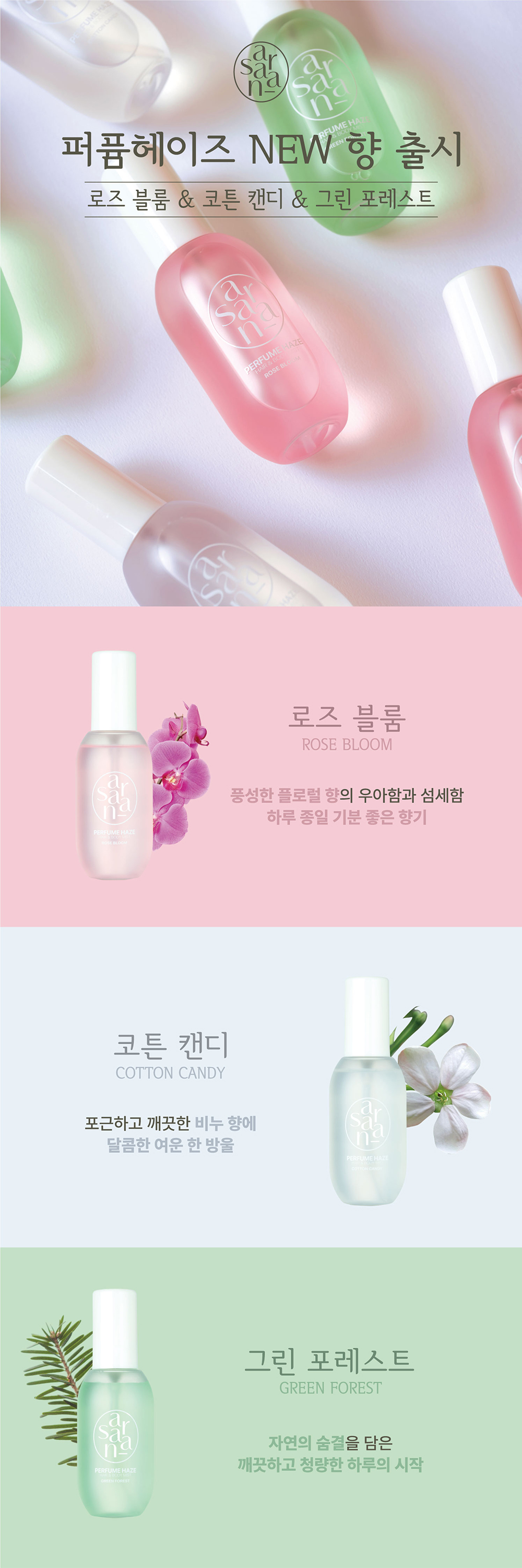 헤어와 바디에 뿌리는 퍼퓸케어 미스트 입니다. 총 5가지 매력적인 향과 식물성 콜라겐, 히알루론산 성분 함유로 탄력과 보습까지 케어합니다.